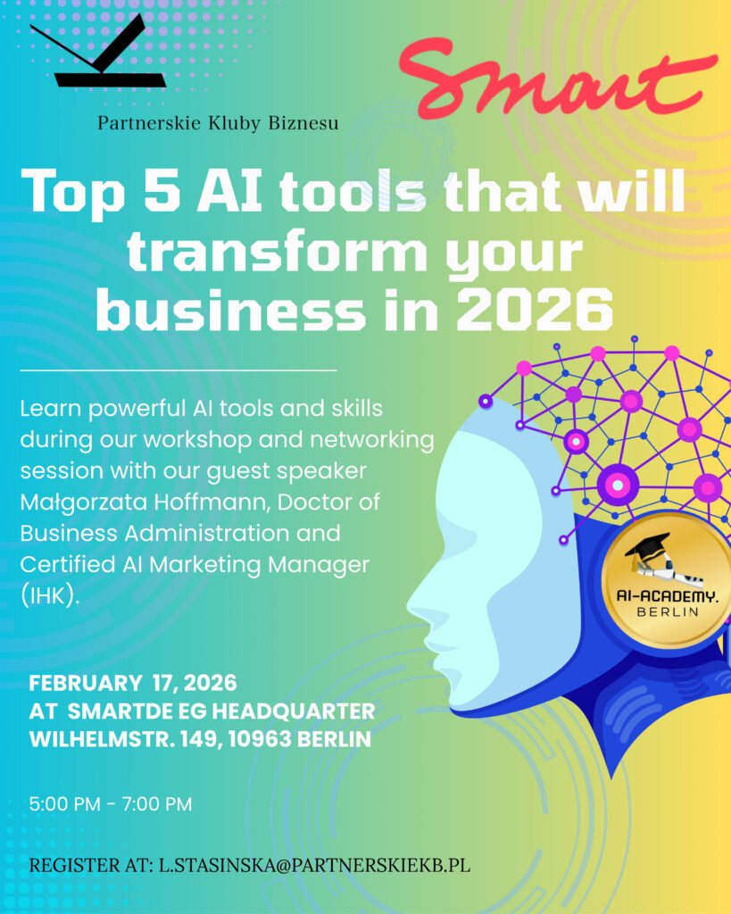 17.02, 17.00 – 19.00 Top AI tools for 2026 at WorkCoopHub Project Space of Smart Coop, Wilhelmstr. 149 10983 Berlin (english language only) https://smartde.coop/events/top-5-ai-tools-that-will-transform-your-business-in-2026/